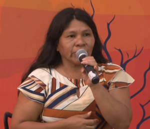 Em sua fala, ela conectou diretamente mudanças climáticas, defesa do território e políticas de demarcação: